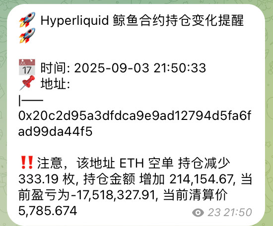 BlockBeats News, September 4th, according to HyperInsight monitoring, the whale who shorted ETH at $2249 last night has reduced holdings by 333.19 ETH, currently facing a loss of approximately $17.938 million, with a liquidation price of $5784.94. This whale established a 25x short position in April when the ETH price was around $2249.7, and then continuously increased the average entry price to around $2760 through ongoing position adding, gradually reducing the position since the end of August.