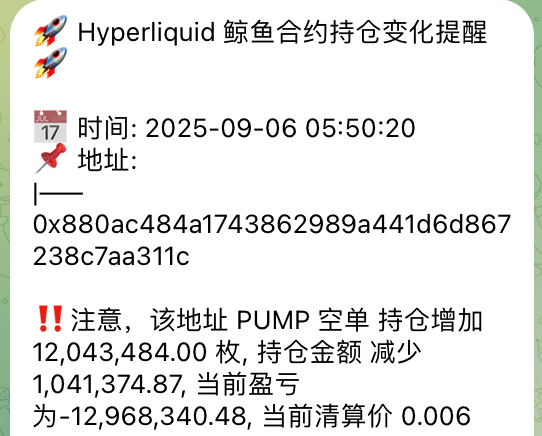 BlockBeats News, September 6th, according to HyperInsight monitoring, the “IronHead Air Force” whale with the address starting with 0x880ac has been continuously shorting multiple currencies over the past month, and the total unrealized loss in the past week has reached approximately $10.41 million. Its largest short is in PUMP, with a short price of $0.0033, and the current unrealized loss for this single coin is about $12.97 million. This address also holds about $30.04 million in SOL shorts, about $12.58 million in BTC shorts, as well as shorts in LINK, BCH, LTC, and other mainstream coins.