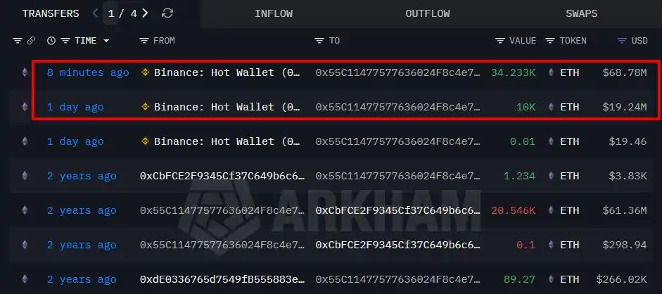 BlockBeats News, February 7, according to Onchain Lens monitoring, a whale dormant for two years withdrew 34,233 ETH worth $68.78 million from Binance 8 hours ago.