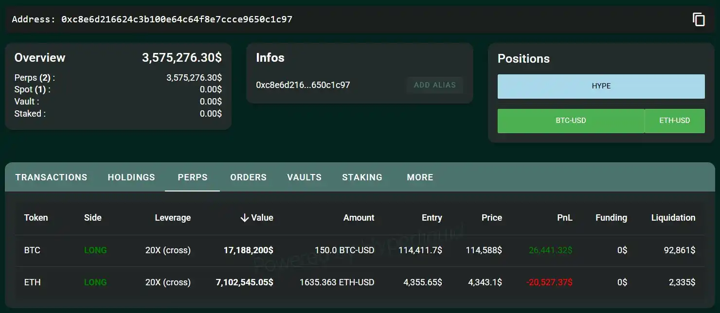 A whale has just deposited 3.57 million USDC into HyperLiquid, going 20x long on ETH and BTC.