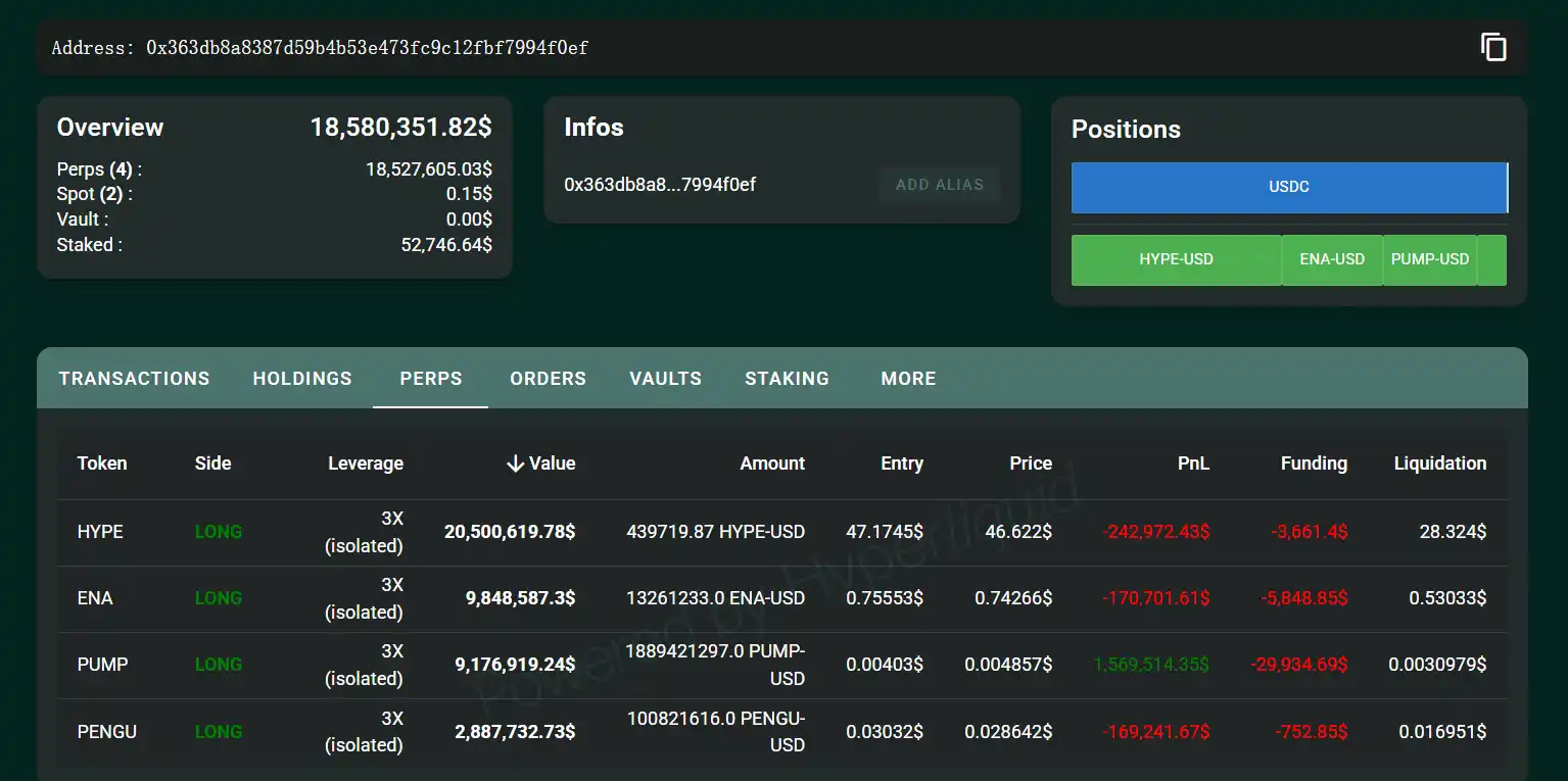 In addition, tummy also holds long positions with 3x leverage in ENA, PUMP, and PENGU, with unrealized losses of $170,000, unrealized gains of $1,569,000, and unrealized losses of $169,000, respectively.