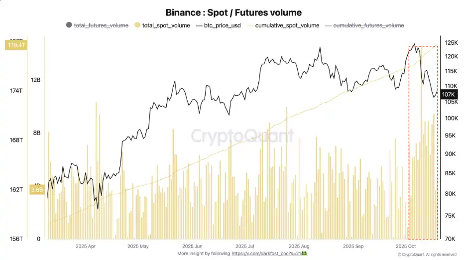 BlockBeats News, October 22nd, according to CryptoQuant analyst Darkfost’s analysis, after a large-scale liquidation event on the 11th, the market has experienced turbulence, and traders are starting to shift to a more cautious spot trading mode. Binance, as the dominant platform in the spot market, has accumulated a BTC spot trading volume of 18 trillion dollars, with daily trading volume increasing from 3 billion to 5 billion dollars in early September to the current 5 billion to 10 billion dollars.