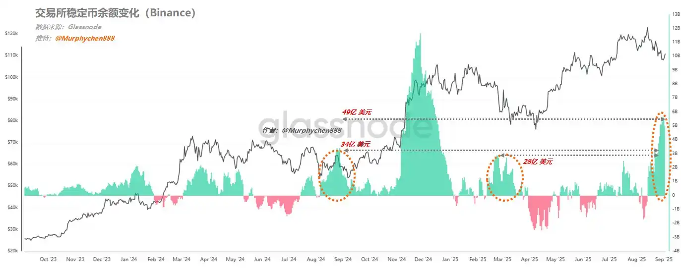 From August 13th to September 3rd, there was a net increase of $4.9 billion, far exceeding the stablecoin balance growth during the same time period after BTC entered a pullback in August 2024 ($3.4 billion) and March 2025 ($2.8 billion). Calculated on a daily basis, the most significant inflows occurred on the following days: