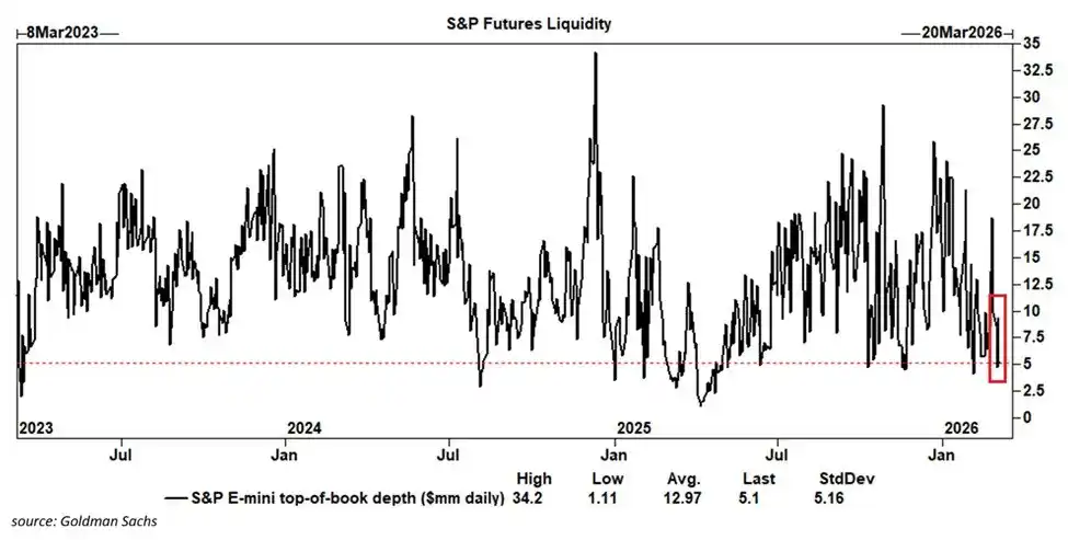 BlockBeats News, March 15th, according to The Kobeissi Letter, against the backdrop of the Iran war, S&P 500 futures liquidity quickly fell to $5.1 million, close to the lowest level since the “Liberation Day” in April 2025, down 61% from the historical average (about $13 million), Goldman Sachs data shows that a level below $7 million is a market stress signal.