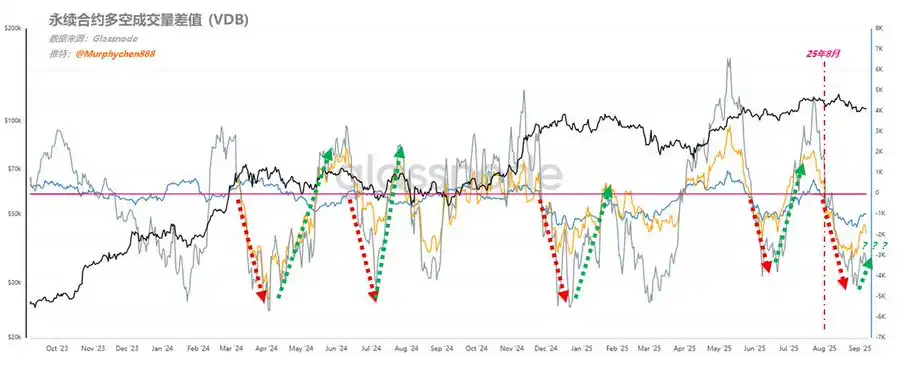 Since early August, Binance and other trading platforms’ VDB has dropped into negative territory, indicating that perpetual contract traders— a speculative group in this market— have increasingly shown a bearish inclination in the subsequent period. However, this indicator has extremely high volatility, so a comparison between “short-term” and “mid-term” is used to observe the direction and magnitude of the deviation to confirm whether this negative bias will develop into a sustained trend (red arrow in the chart).