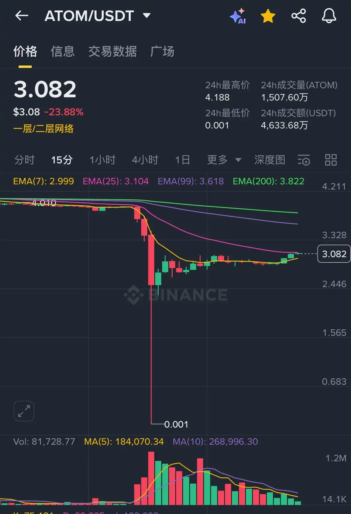 BlockBeats News, October 11th, according to market data, as the crypto market experienced a flash crash early this morning, Cosmos (ATOM) spot trading on Binance (USDT pair) plummeted to $0.001 at 5:00 AM today and is now trading at $3.08.