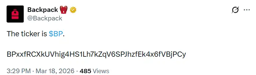 BlockBeats News, March 18, Backpack officially released its token symbol “BP” on social media, along with the contract address.