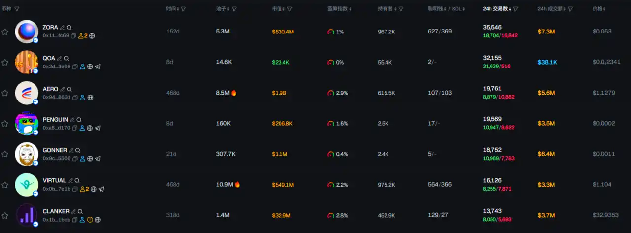 BlockBeats News, September 23rd, according to GMGN monitoring, the Base chain’s topic heat has surged again, possibly influenced by the Rainbow’s planned acquisition of Clanker (the latter has rejected the acquisition proposal). Recent trading activities have been active, and liquidity and narrative-driven enhancements have been observed. Veteran protocols such as ZORA, AERO, and VIRTUAL are maintaining medium to high trading volumes. Among them, ZORA has a market capitalization of $630.4 million, a 24-hour trading volume of $7.3 million, 35,500 transactions, and a current price of $0.063; AERO has a market capitalization of $1.9 billion, a 24-hour trading volume of $5.6 million, and a current price of $1.1279.