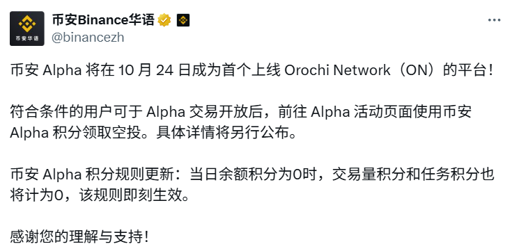 BlockBeats News, October 22, according to the official announcement, Binance Alpha Point Rules Update: When the daily balance points are 0, both trading volume points and task points will also be counted as 0, and this rule will take immediate effect.