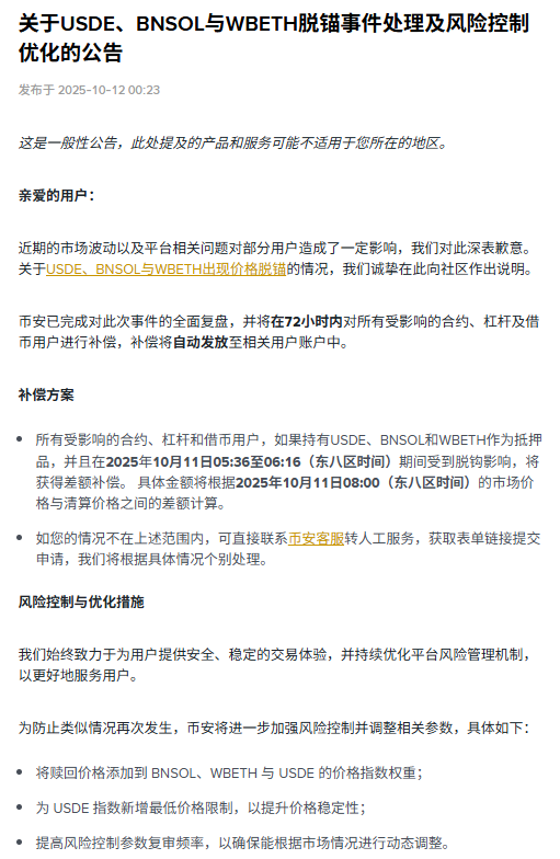 BlockBeats News, October 12th, Binance released the “Announcement on USDE, BNSOL, and WBETH Detaching Incident Handling and Risk Control Optimization.” The announcement stated that Binance has completed a comprehensive review of the incident and will compensate all affected futures, margin, and borrowing users within 72 hours. The compensation will be automatically distributed to the relevant user accounts.
