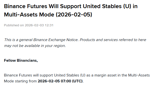 BlockBeats News, February 3rd, according to official sources, Binance Futures will support United Stables (U) as a collateral asset in cross-margin mode starting from 07:00 AM (UTC) on February 5, 2026.