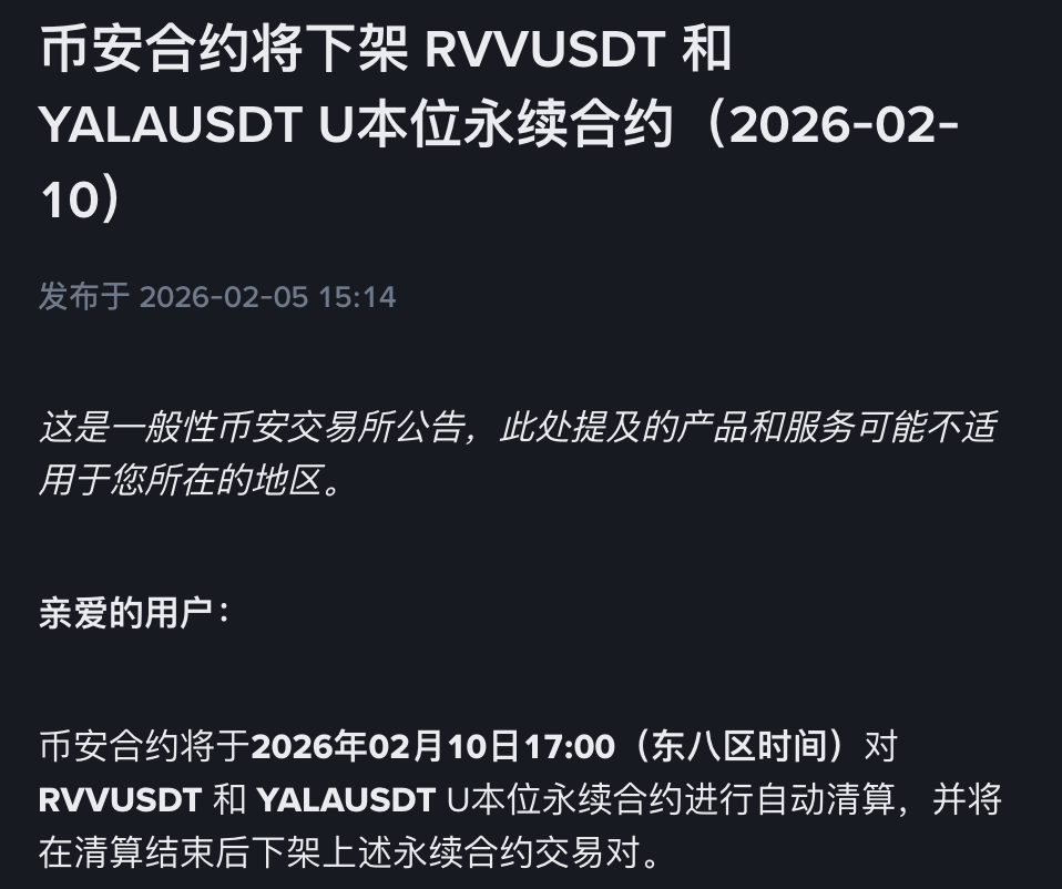 BlockBeats News, February 5th, according to an official announcement, Binance Futures will conduct an auto-deleveraging of the RVVUSDT and YALAUSDT U perpetual contract on February 10, 2026, at 17:00 (UTC+8), and will delist the above perpetual contract trading pairs after the liquidation.