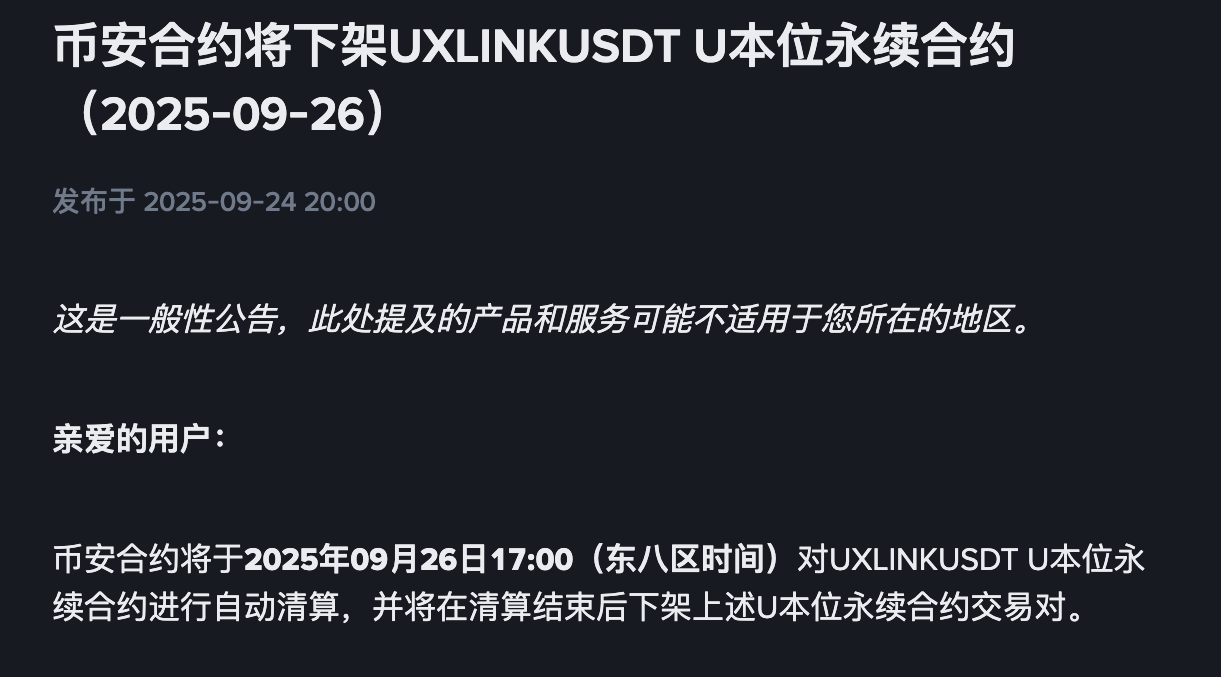BlockBeats News, September 24, according to an official announcement, Binance Futures will automatically settle the UXLINKUSDT U perpetual contract on September 26, 2025, at 17:00 (UTC+8), and will delist the above U perpetual contract trading pair after the settlement.