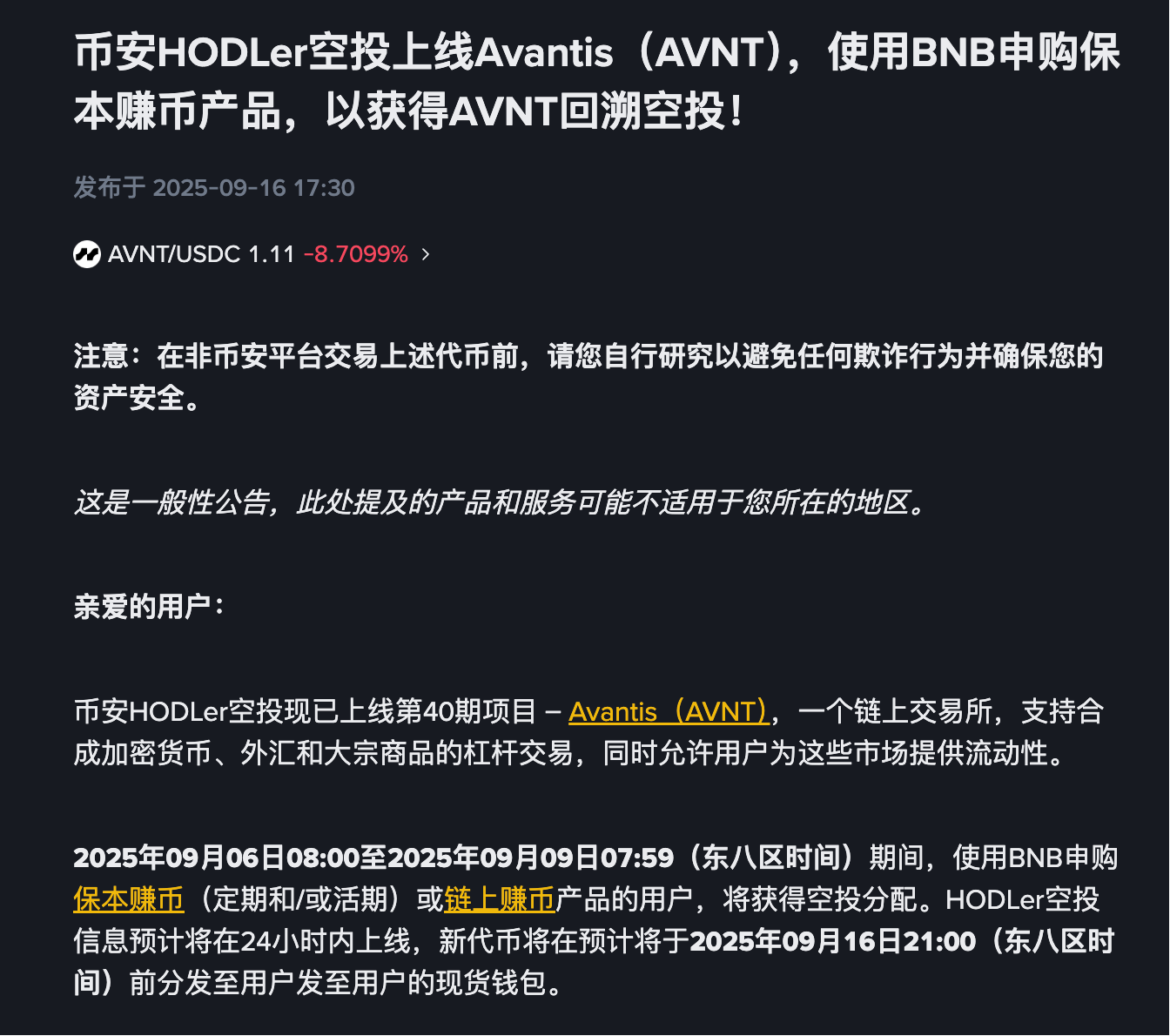 BlockBeats News, September 16th, according to an official announcement, the Binance HODLer Airdrop has now launched the 40th project – Avantis (AVNT), an on-chain trading platform that supports leveraged trading of synthetic cryptocurrencies, forex, and commodities, while allowing users to provide liquidity for these markets.