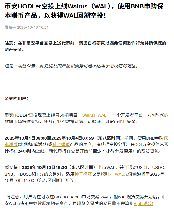 BlockBeats News, October 10th. According to the official announcement, Binance HODLer Airdrop launched the 50th project Walrus (WAL). Users who purchased the Yield Farming (Fixed or Flexible) or Staking products using BNB from 08:00 on October 1st to 07:59 on October 4th, 2025 (GMT+8) will receive the airdrop allocation. The HODLer Airdrop details are expected to be live within 24 hours, and the new token will be distributed to users’ spot wallets at least 1 hour before trading begins.