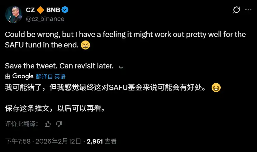 BlockBeats News, February 12th, Binance founder CZ stated that he is confident in the decision to convert $1 billion from the Binance SAFU Fund to BTC, inviting everyone to collectively verify the results in the future. “I may be wrong, but I have a feeling that ultimately this may be good for the SAFU Fund. Save this tweet, it may be useful to look back on in the future.”