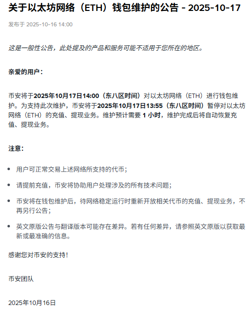 To support this maintenance, Binance will suspend deposits and withdrawals for the Ethereum Network (ETH) starting at 13:55 on October 17th. The maintenance is expected to take 1 hour, and deposit and withdrawal services will automatically resume after the maintenance is completed.