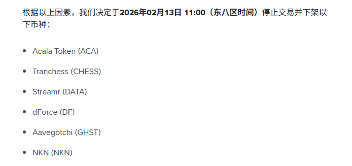 BlockBeats News, February 2nd, Binance announced that it will suspend trading and delist Acala Token (ACA), Tranchess (CHESS), Streamr (DATA), dForce (DF), Aavegotchi (GHST), and NKN (NKN) all spot trading pairs on February 13 at 11:00.