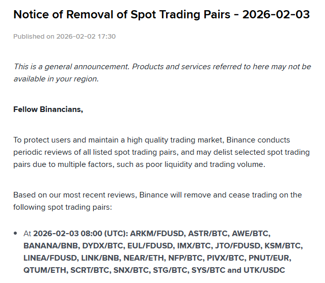 BlockBeats News, February 2nd, according to an official announcement, Binance will delist and cease trading for the following spot trading pairs on February 3rd at 16:00: ARKM/FDUSD, ASTR/BTC, AWE/BTC, BANANA/BNB, DYDX/BTC, EUL/FDUSD, IMX/BTC, JTO/FDUSD, KSM/BTC, LINEA/FDUSD, LINK/BNB, NEAR/ETH, NFP/BTC, PIVX/BTC, PNUT/EUR, QTUM/ETH, SCRT/BTC, SNX/BTC, STG/BTC, SYS/BTC, and UTK/USDC.
