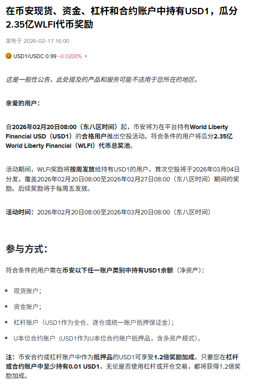 BlockBeats News, February 17, According to an official announcement, starting from 08:00 on February 20, 2026 (UTC+8), Binance will launch an airdrop event for eligible users holding World Liberty Financial USD (USD1) on the platform. Qualified users will share a total prize pool of 235 million World Liberty Financial (WLFI) tokens.