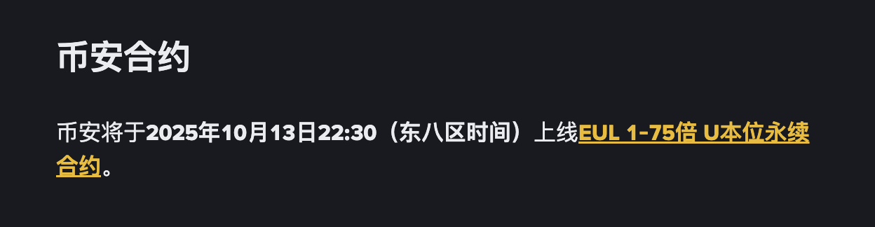 Binance will launch EUL perpetual contracts with 1-75x leverage on October 13, 2025, at 22:30 (UTC+8).