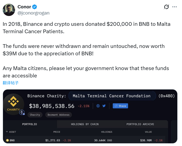BlockBeats News, October 14th, Coinbase executive Conor Grogan stated in a post that the $200,000 worth of BNB donated by Binance and crypto users to the Malta Community Chest Fund in 2018 for a terminal cancer patient remains unclaimed to this day, now valued at approximately $39 million due to the price increase.