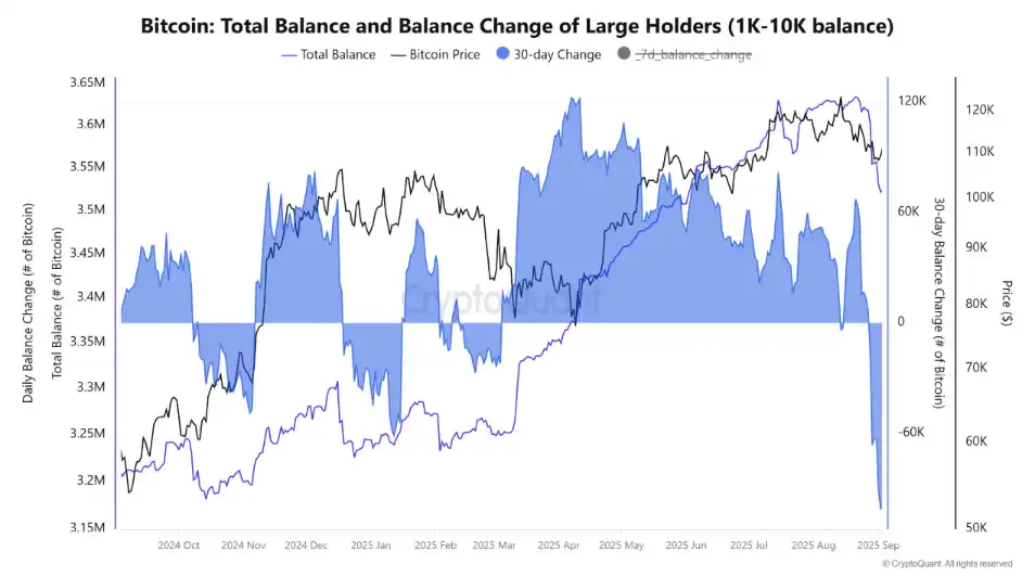 BlockBeats News, September 8th, CryptoQuant analyst caueconomy stated on Friday that in the past thirty days, whale reserves (holding between 1k to 10k BTC) have decreased by over 100,000 bitcoins, indicating a strong risk-off sentiment among large investors. Currently, we are still seeing major participants reducing their portfolios, which may continue to put pressure on Bitcoin in the coming weeks.