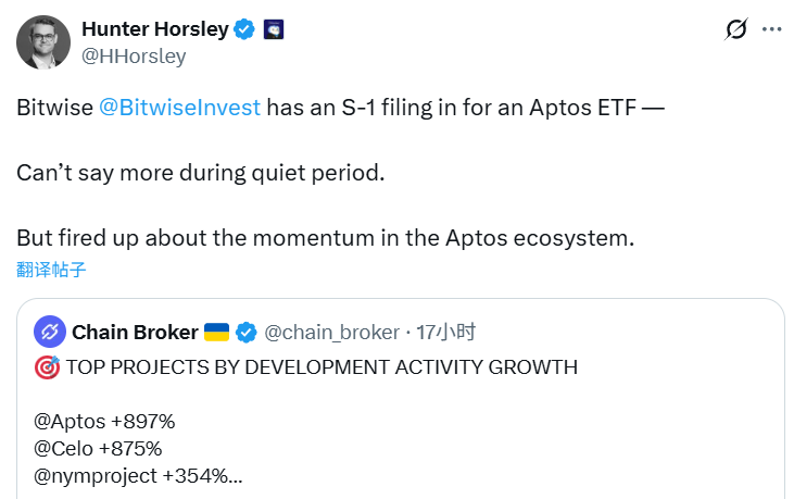 BlockBeats News, October 4th, Bitwise CEO Hunter Horsley announced that Bitwise has submitted the S-1 filing for the Aptos ETF. “Can’t say much during the quiet period. But excited about the development momentum of the Aptos ecosystem.”