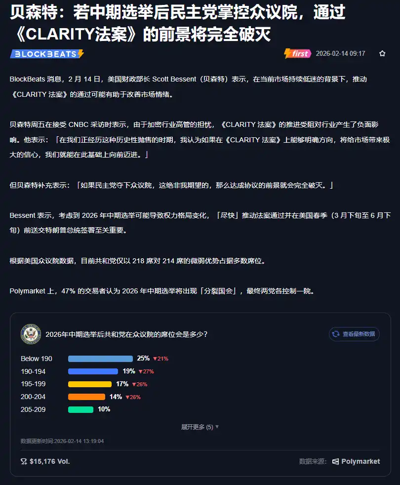 BlockBeats News, February 14th, BlockBeats has now fully integrated Polymarket prediction market data on the PC website (mobile end coming soon). As the world’s first media platform to deeply embed prediction markets into the news feed, users can directly view key indicators such as the current probability, trading volume, liquidity depth, and price trends of the corresponding event on Polymarket in related real-time news, event reports, and special briefings, without switching platforms to get an overview of the market consensus.