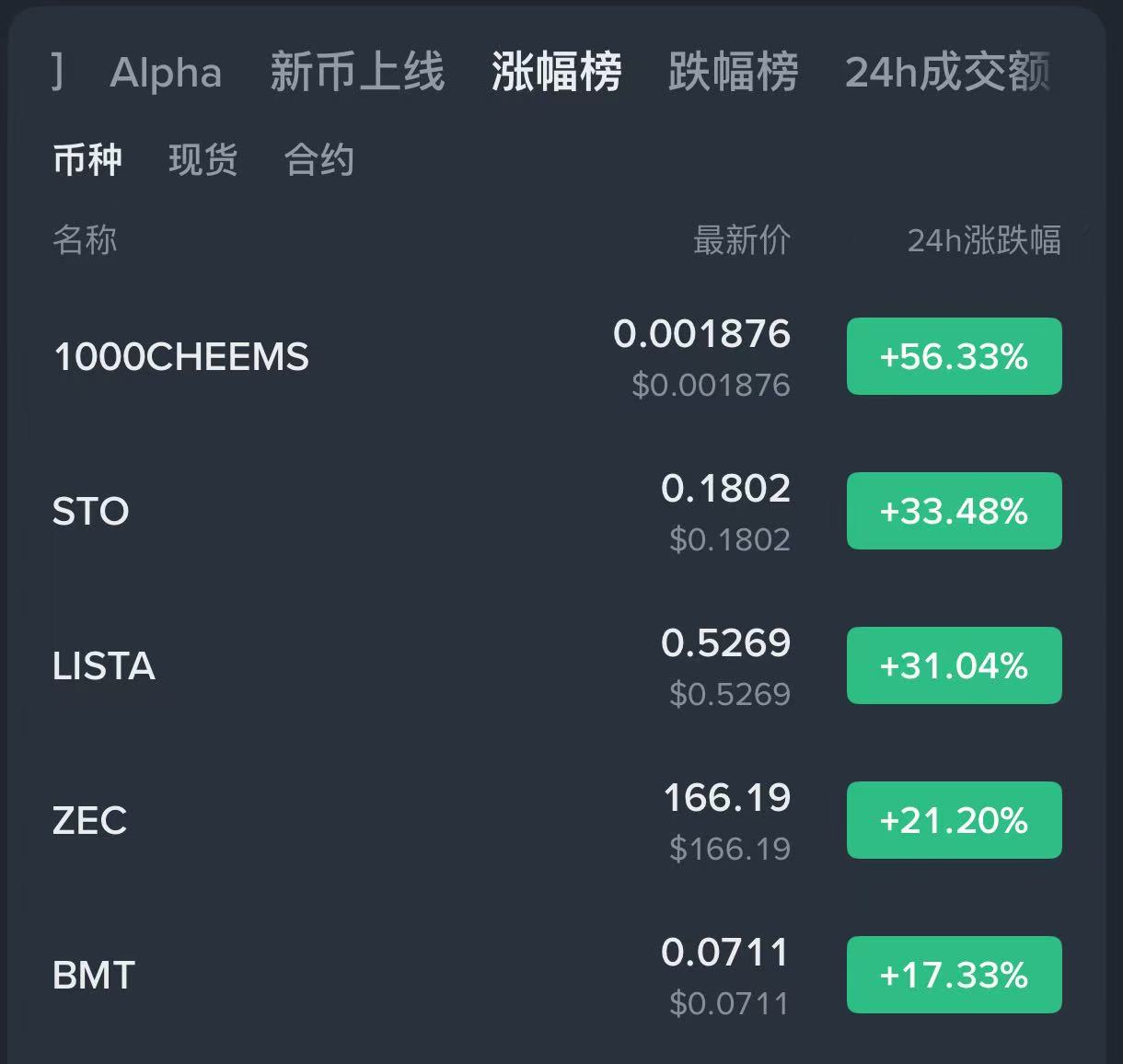 CHEEMS surges over 56% in 24 hours, claiming the top spot on Binance's list of top gainers