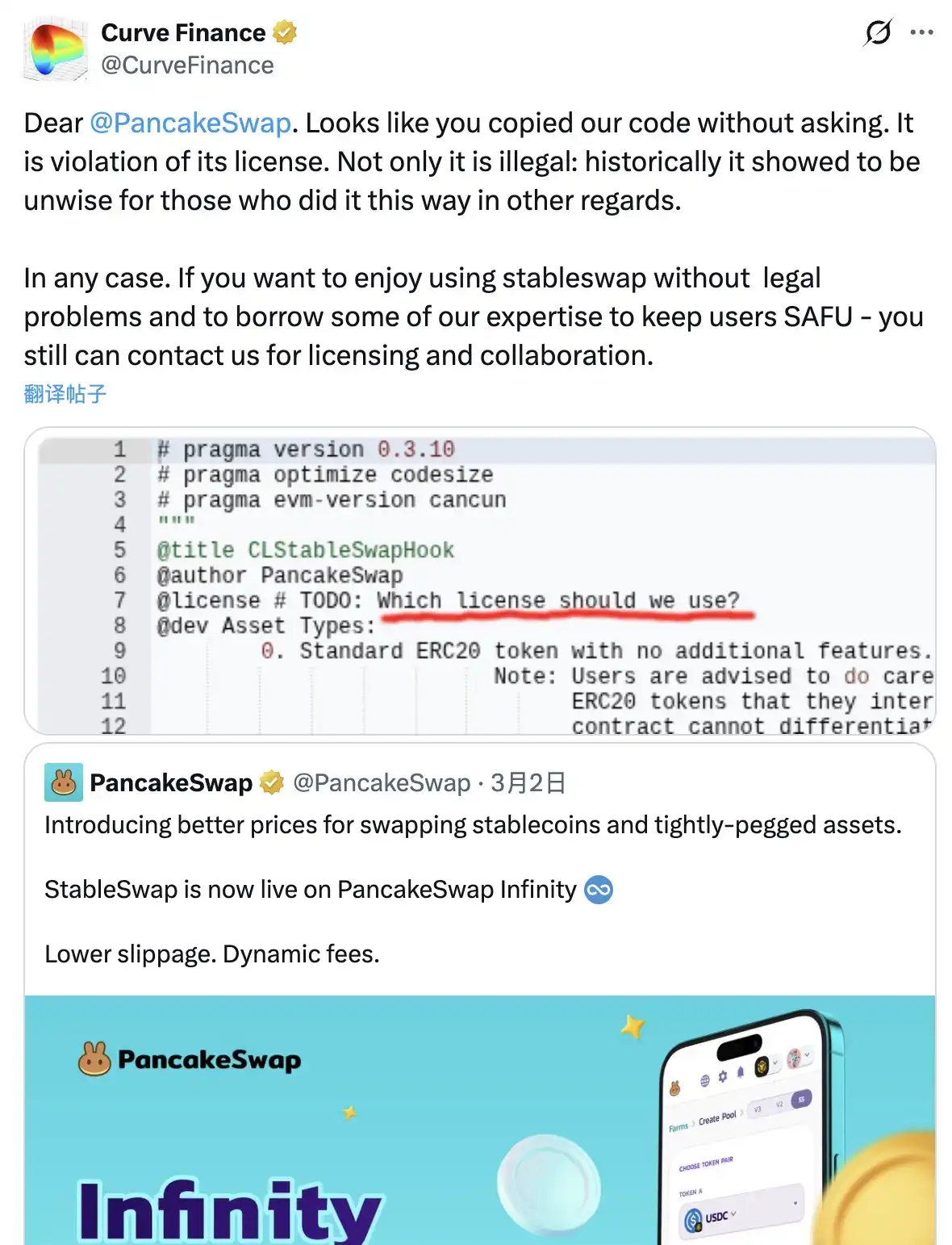 BlockBeats News, March 6th, Curve Finance announced on social media that PancakeSwap allegedly copied its code without permission, violating the relevant open-source license. Curve stated that this action not only raises legal issues but, based on historical experience, is often unwise for projects that use its code in a similar manner.