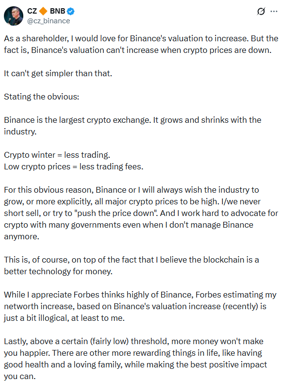 BlockBeats News, March 12th, CZ continued to respond to the community regarding Forbes’ inclusion of himself in the top 20 billionaires list. CZ stated, “As a shareholder, of course, I hope Binance’s valuation can rise. But the fact is, when cryptocurrency prices are low, Binance’s valuation cannot rise.” Binance is the largest cryptocurrency exchange platform. It has experienced ups and downs with the industry’s development.