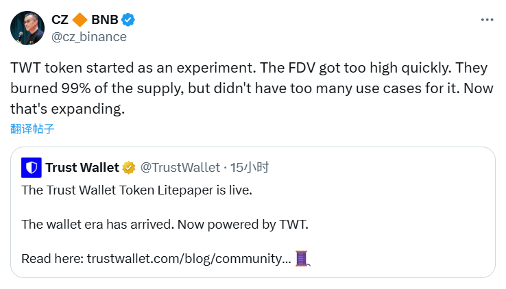 BlockBeats News, September 19th, CZ retweeted the “Trust Wallet Token Litepaper Update” tweet and stated that the TWT token was originally just an experiment. FDV rose quickly. They burned 99% of the supply but didn’t have many use cases. Now, the use case is expanding.
