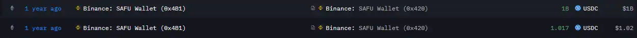 BlockBeats News, January 30, according to on-chain data and historical announcements, tweet content shows that Binance’s “1 Billion USD SAFU Fund” funds were transferred from the “old SAFU address” to the new SAFU wallet address (0x420) mentioned in the announcement a year ago, all in USDC, and there has been no action taken so far.