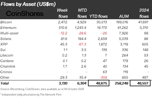 BlockBeats News, October 9th, CoinShares Research Director James Butterfill revealed data showing that global digital asset fund inflows have exceeded the total for the previous year, reaching $48.67 billion since the beginning of the year. However, funds flowing into altcoins currently appear to be limited to SOL and XRP.