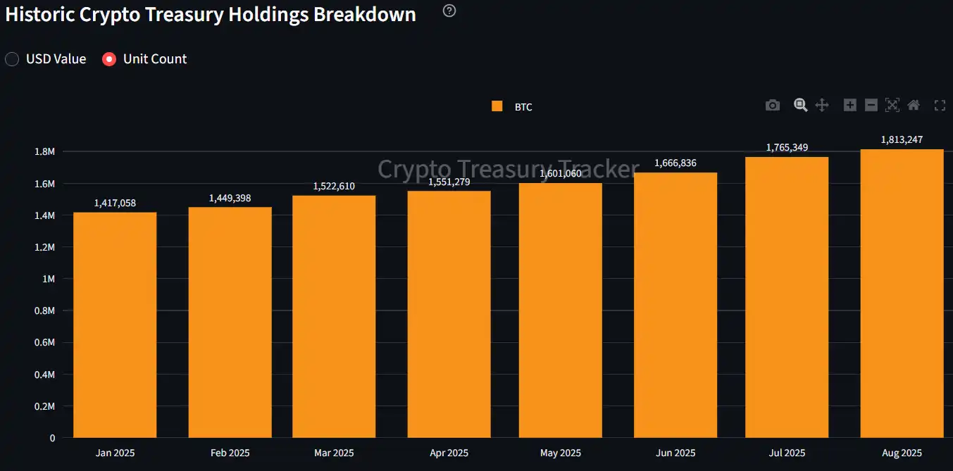In January of this year, the Bitcoin Treasury Company held 1,417,058 BTC, which had grown to 1,813,247 BTC by August.
