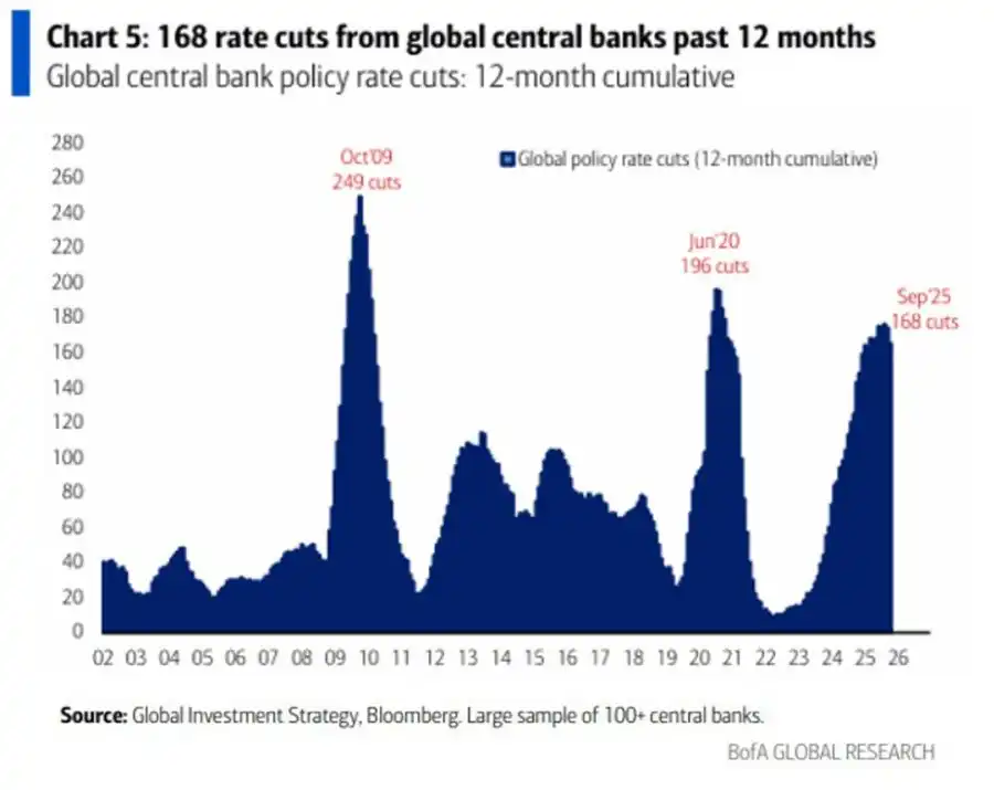 BlockBeats News, September 29th, according to Kobeissi Letter data, in the past 12 months, central banks around the world have cut interest rates 168 times, marking the third-highest number of interest rate cuts in this century. The previous peak was 196 interest rate cuts in the 12 months after June 2020.