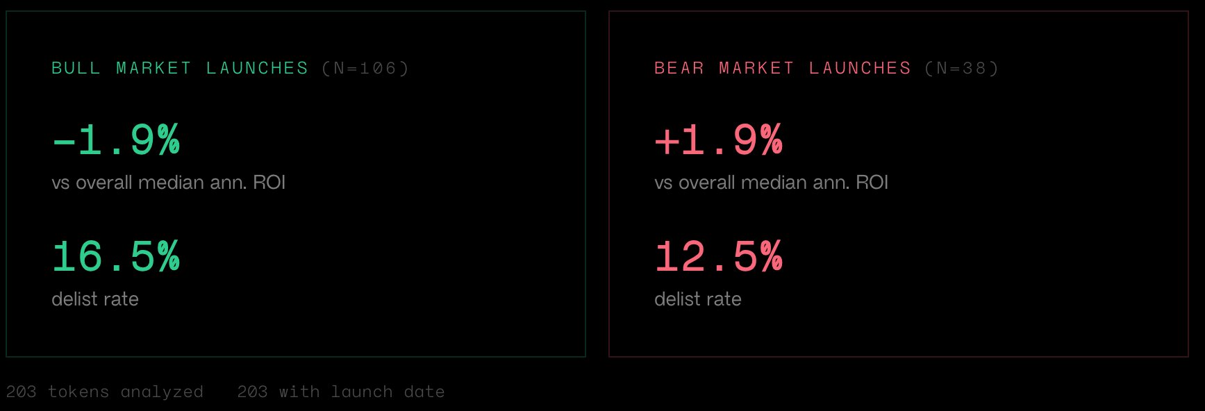 BlockBeats News, February 15th, Dragonfly partner Haseeb wrote that every cryptocurrency founder thinks they need to launch a token during a bull market. But they are wrong, the timing of issuance is not important. Haseeb analyzed the listing data on Binance and concluded that there is no significant difference in the annualized ROI of tokens launched in bull markets versus bear markets, and any such “difference” is just noise.