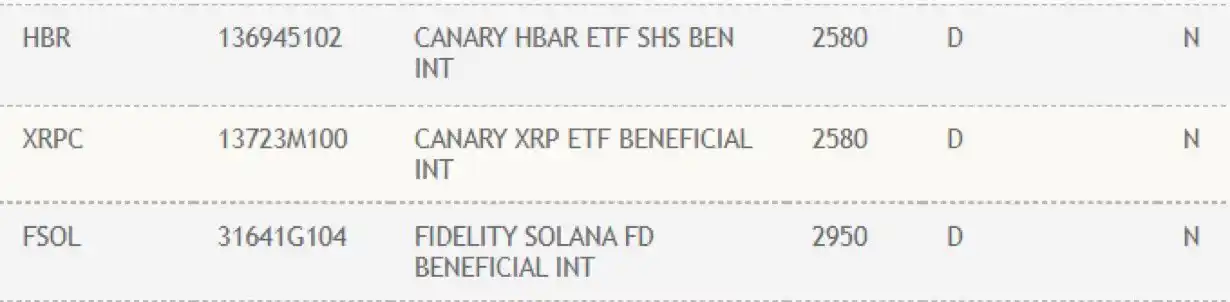 BlockBeats News, September 12th, according to market sources, DTCC (Depository Trust & Clearing Corporation) has listed the Fidelity Solana ETF (FSOL), Canary Hedera ETF (HBR), and Canary XRP ETF (XRPC).