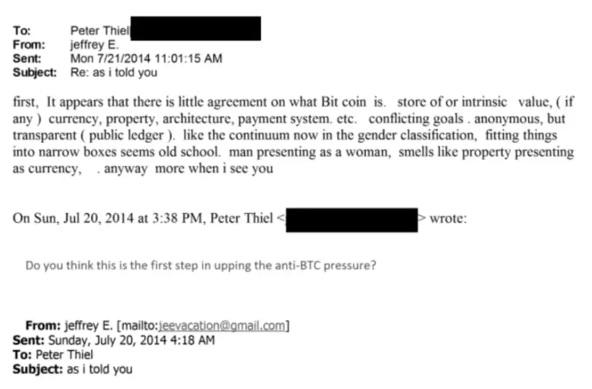 In 2013, Epstein also discussed Bitcoin with Bill Gates’s former Chief Technology Officer Boris Nikolic and Steven Sinofsky, a16z Board Partner and former President of the Microsoft Windows Division. Even in 2014, Epstein had in-depth discussions with PayPal co-founder Peter Thiel about the nature of Bitcoin. In the email, Epstein stated, “There is no consensus on what Bitcoin is, whether it is a store of value, a currency, or property… just as a man dressed as a woman, or property disguised as currency.”