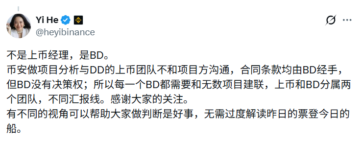 “The Binance listing team, responsible for project analysis and DD (Due Diligence), does not communicate with the project teams. All contract terms are handled by BD, but BDs do not have decision-making power; therefore, each BD needs to connect with numerous projects. Listing and BD belong to two separate teams with different reporting lines. Thank you all for your attention. Different perspectives can help everyone make judgments, and there is no need to overinterpret yesterday’s ticket as today’s ship.”