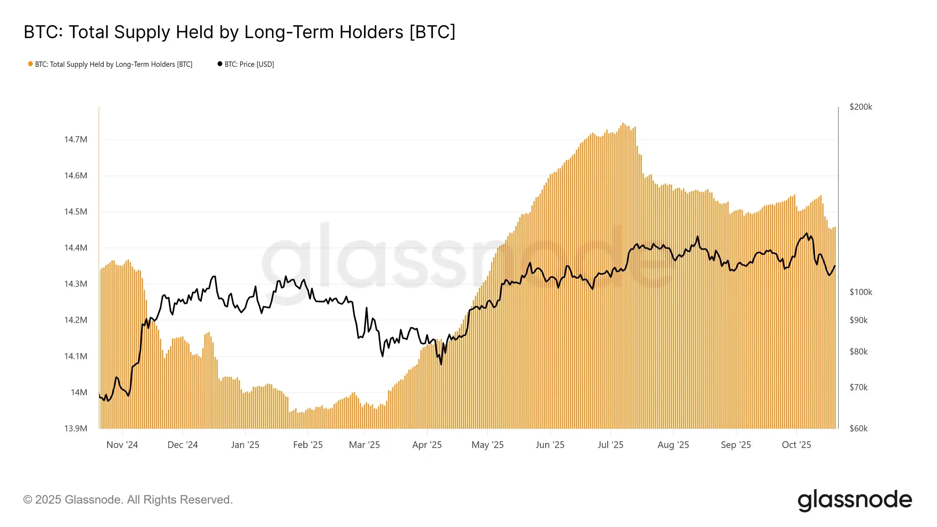 BlockBeats News, October 22, according to glassnode data, since October 15, the holdings of Bitcoin long-term holders have decreased by another 28,000 BTC, reflecting an excessive net outflow from long-term holders.