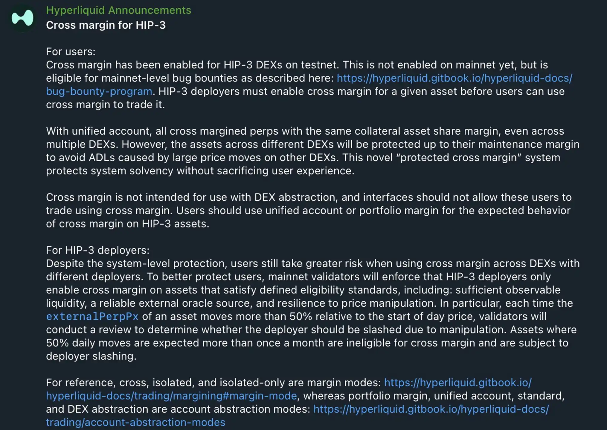 BlockBeats News, February 13th, according to official sources, Hyperliquid announced that the cross-margin feature of HIP-3 permissionless perpetual contract market has been enabled on the testnet but not yet on the mainnet. However, this feature qualifies for the mainnet-level bug bounty program. Deployers of HIP-3 must first enable cross-margin for an asset before users can use that asset for cross-margin trading.