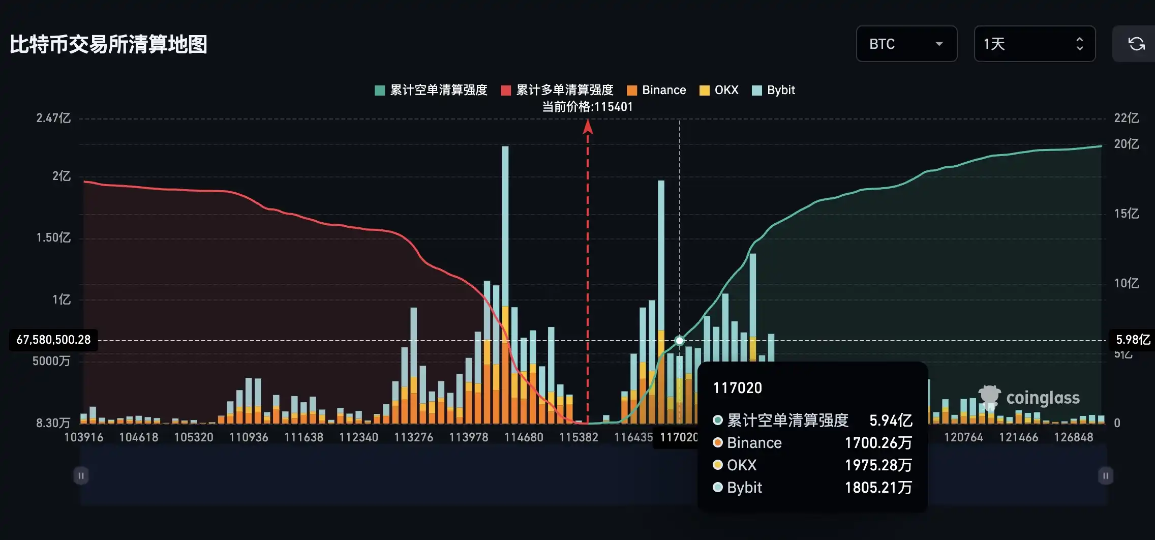 BlockBeats News, September 20th, according to Coinglass data, if Bitcoin breaks through $117,000, the cumulative short liquidation intensity of mainstream CEX will reach $594 million.