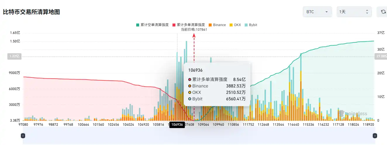 According to Coinglass data, if Bitcoin falls below $107,000, the cumulative long liquidation strength of mainstream CEXs will reach $854 million.