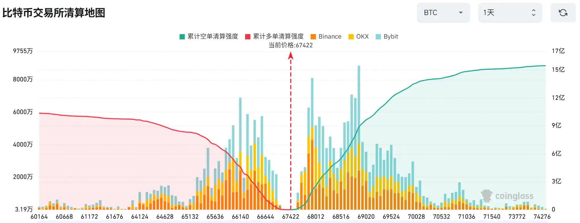 Conversely, if Bitcoin falls below $66,000, the total long liquidation strength of mainstream CEX will be $541 million.
