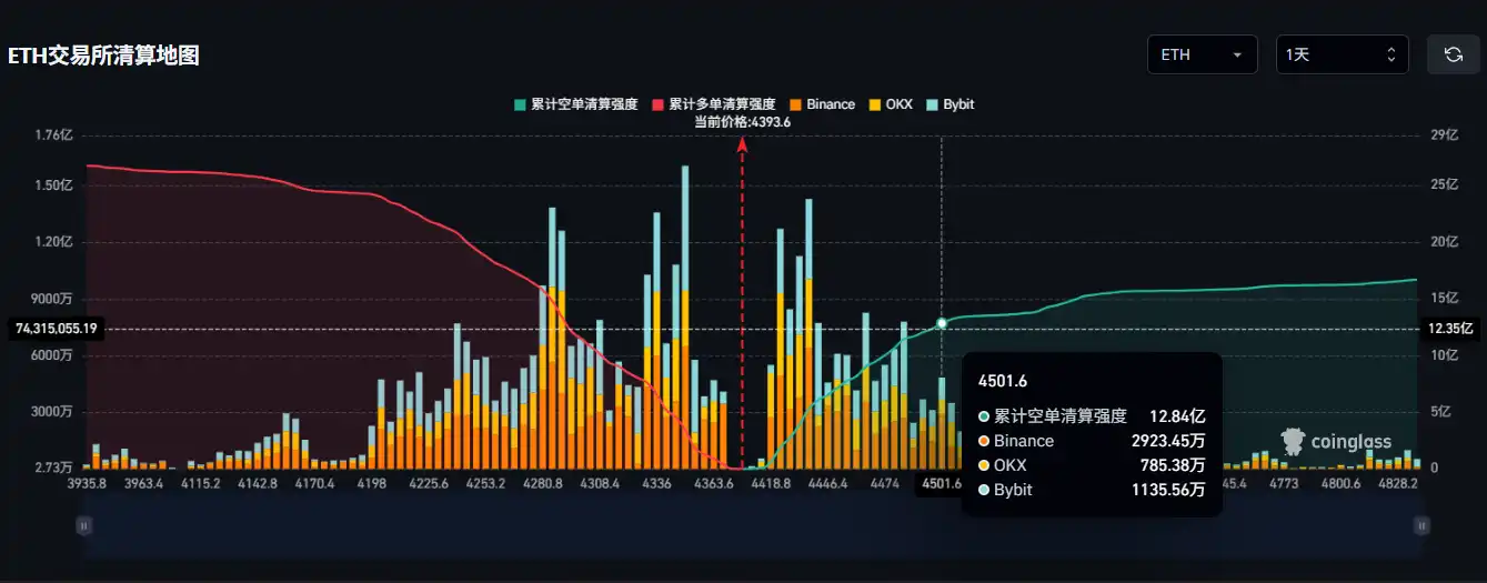 BlockBeats News, October 2nd, according to Coinglass data, if Ethereum rebounds above $4500, the cumulative short liquidation intensity on mainstream CEXs will reach $1.284 billion.