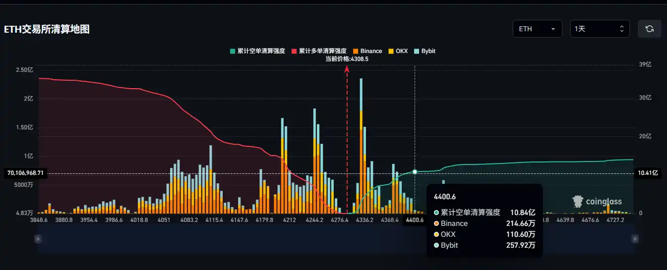 BlockBeats News, October 1st, according to Coinglass data, if Ethereum rebounds above $4400, the cumulative short liquidation intensity on mainstream CEXs will reach $1.084 billion.