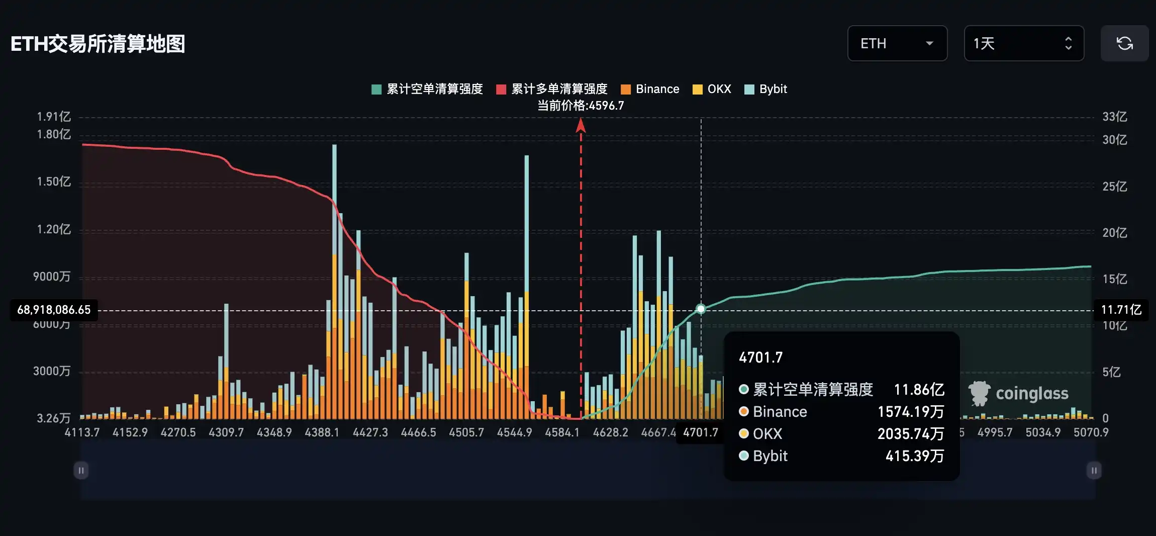 BlockBeats News, September 18th, according to Coinglass data, if Ethereum breaks through $4700, the cumulative short liquidation intensity of mainstream CEXs will reach $1.186 billion.