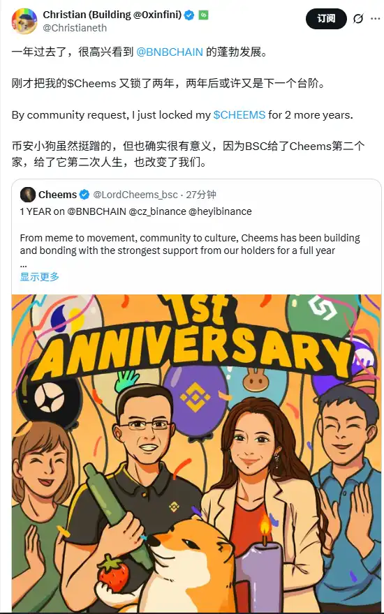 BlockBeats News, October 9th, Infini founder Christian announced in a post that he is pleased to see the thriving development of the BNB Chain ecosystem and has added to his personal Cheems token holdings with an additional two-year lockup. “BSC has given Cheems a second home, given it a second life, and has also changed us.”
